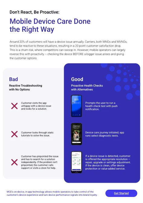 Mobile device health can be a crux for churn for mobile operators, as 75% of customers partly or fully rely on their wireless provider for help with managing its health. In our infographic below, we highlight the do’s and dont’s of mobile device care for customers — how reactive care looks like vs. proactive care. Click the image below to view the full infographic.