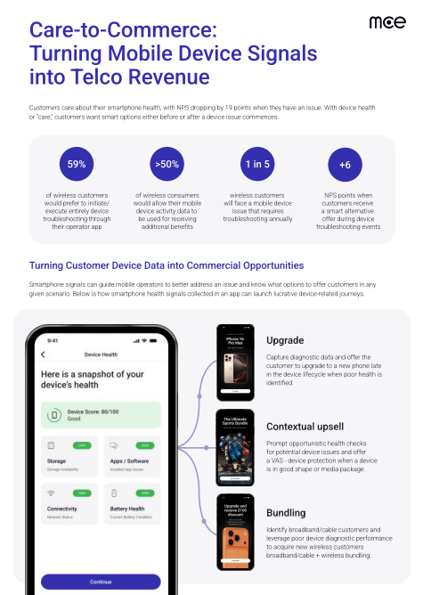 Customers care about their smartphone performance and like getting smart options, including commercial offers, around their device health. Here are 3 offers mobile operators can pull off right in their customer-facing app by capturing device diagnostic signals and then using a next best action mechanism to make the right offer. Click the image below to see the full one-pager.