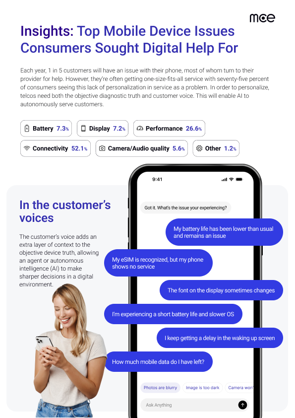 Up to 80 percent of telecom customers either partly or fully rely on their provider for help preventing or helping them resolve these issues. Being right there at this juncture of potential churn means you can prevent it โ by offering customers quick and convenient resolutions. MCEโs AI-led diagnostics technology sits right on the device or in an app and helps customers resolve these issues quickly or proactively identify them before they become more complex. When escalation is required, we can help manage a repair routing, streamline customer support connectivity or offer a personalized replacement device (trade-in/upgrade). This is how customer loyalty is bolstered. Learn more about our device care service solution here.